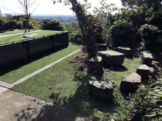 桜の周りに天然の石で椅子とテーブルを作りました。